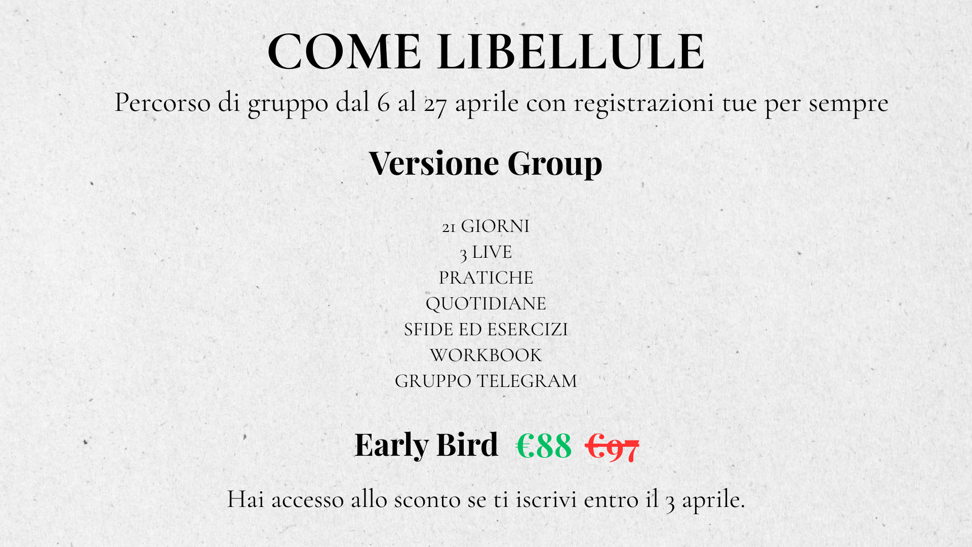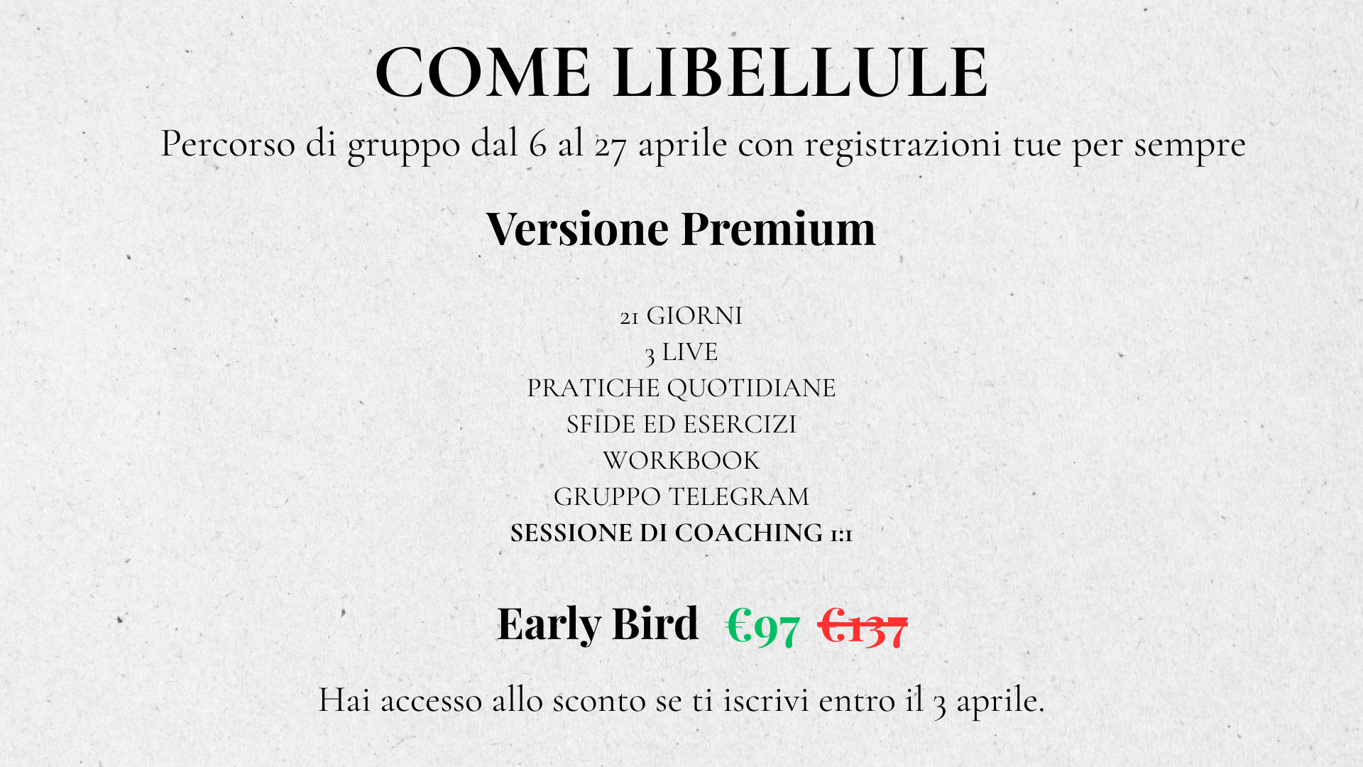 Nella versione Premium hai accesso a tutto ciò che c’è nella versione Group + una sessione di coaching 1:1 per portare tutto nella pratica della tua vita quotidiana e creare, se vorrai, un piano d’azione per manifestare concretamente i tuoi nuovi apprendimenti e consapevolezze emerse in questo meraviglioso viaggio insieme.